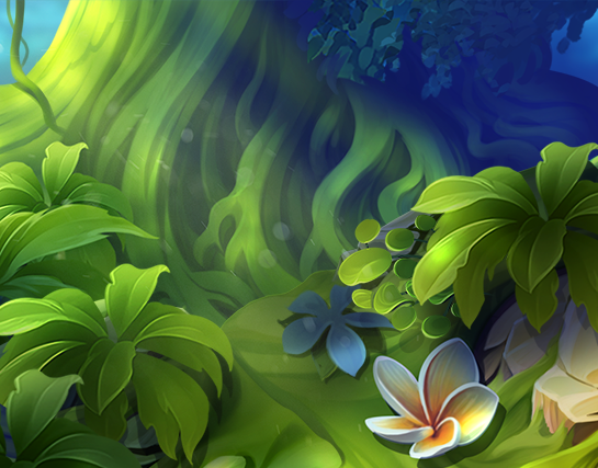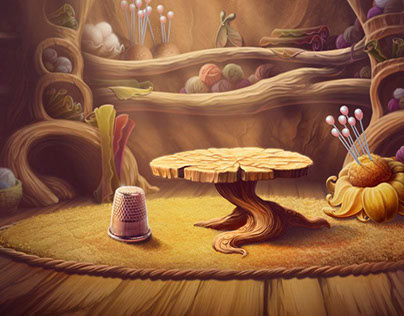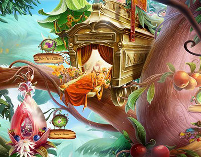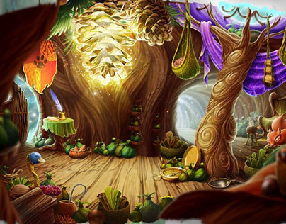 Interior of Kit's Hideout--the "quest giver" fairy who challenges players to do things on the mainland (aka. the real world). Designed and painted by me using Photoshop CS5. I left in the messy matte to show the parallaxing layers. Art Directed by Tammy Manis.