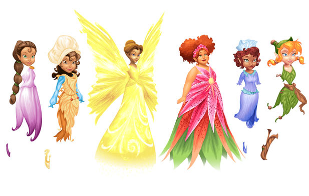 Vector versions of Pixie Hollow franchise characters created by me in Illustrator CS5 and Flash CS5. These are costumes and faces created to work with PH’s in-game fairy mannequins so famous fairies can fly among the players in the MMO. The “missing” arms, hands, or necks are pieces supplied by the generic fairy mannequin. Original Designs by Disney Toon Studios and Disney Publishing. Art direction Anthony Licon